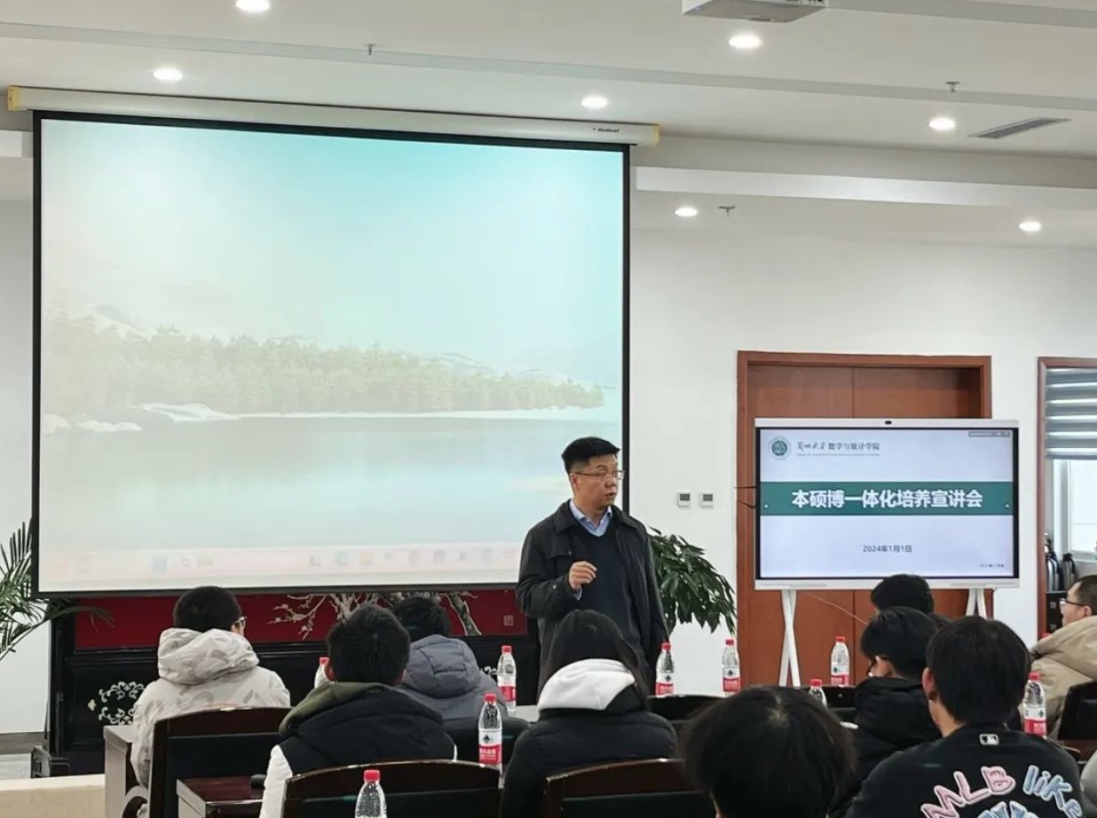 宣讲会上,邓伟华教授介绍了实施该项目的背景,强调了构建包含本科生在内的导学团队的重要性。他讲到,2023年以来,全院师生深入学习贯彻习近平新时代中国特色社会主义思想和党的二十大精神,坚持以教育、科技、人才一体化发展促进公司数学学科基础研究能力提升,在各方面取得了一定成绩。当前,公司聚焦“服务需求,提高质量”重要目标,主动对接国家重大战略需求,加强一流人才培养体系,亟需推动本科生、硕士生、博士生在知识学习、科研训练和能力培养方面的有机衔接,引导数学专业员工了解并熟悉专业发展及应用前景,有效发挥数学学科优势。他还鼓励在场有兴趣参与科研项目的同学们,要坚定理想信念,积极投入到基础理论学习,构建扎实的数理底层逻辑。要明确深造目标,尽早确定从事科研的短期或长期目标,努力争取升学读研机会,为将来投入基础研究奠定基础。要激发自身潜力,将专业学习与科研训练,甚至与其他学科相结合,从现实问题寻找科研兴趣点,通过科研成果为社会发展做出贡献。