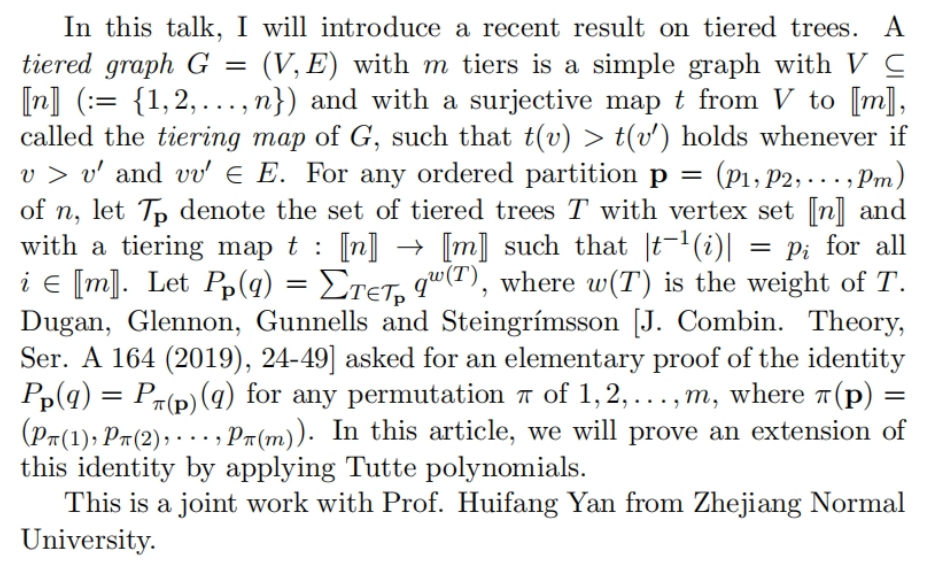 董峰明教授,1997年于新加坡国立大学获博士学位,任教于南洋理工大学,是图多项式领域的国际著名专家。在图多项式、染色、匹配、生成树等图论与组合数学的很多领域作出了重要工作,例如证明了色多项式的Shameful Conjecture等,在J. Combin. Theory Ser. B,J. Combin. Theory Ser. A,Combin. Probab. Comput.,SIAM J. Discrete Math.,J. Graph Theory等组合数学顶级杂志上发表论文多篇。