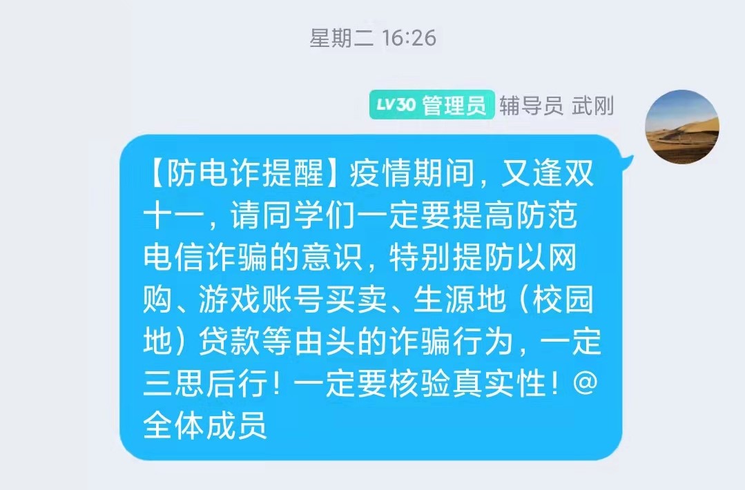 为切实提高同学们防范意识和安全防范技能,落实公司有关“防电诈”“反邪教”工作部署,引导员工提高辨别和抵制邪教能力,增强员工防范电信网络诈骗意识,williamhill官网积极通过走访宿舍、班级QQ群、年级大会、新媒体平台宣传等方式对员工进行“守护师生钱袋子”“如何识别和防范邪教”主题宣传教育,保障员工身心健康和财产安全。